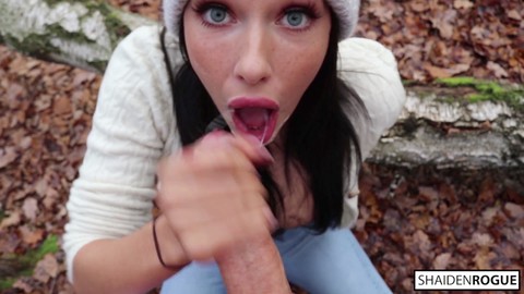 Innocent German teen Shaiden Rogue gives a messy outdoor blowjob with freckles and swallows it all