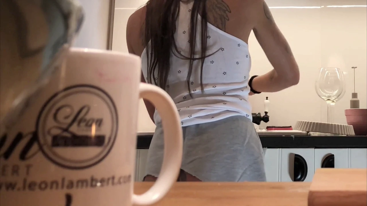 Inexperienced Dark-Haired Amateur Goes Commando In The Kitchen